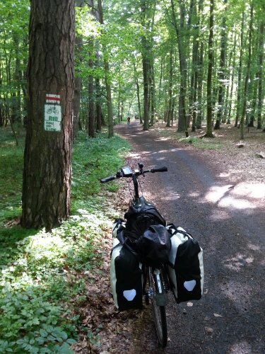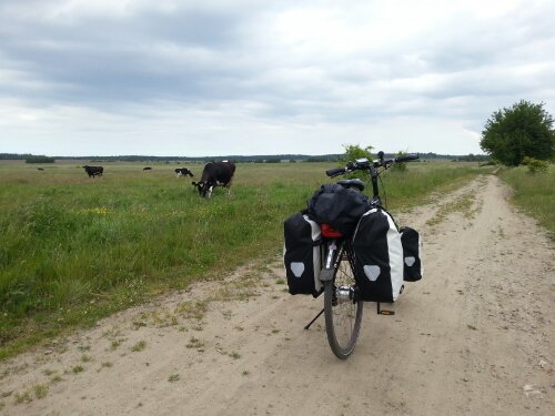 An absolutely awesome day. Top notch bike paths, speed stretches on good road surfaces, bumpy, sliding sand tracks, fields, forests, bush bashing. 203km to Leba.