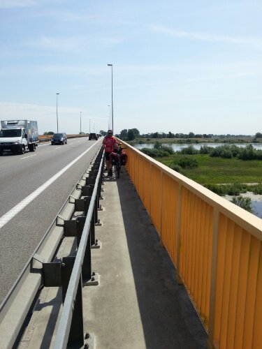 My route to Elblag was changed due to a ferry that wasn’t running. High water levels (like in Germany). I met two German cyclists at the ferry, and together we worked out an alternate route. It was a bit of playing it by ear. We ended up crossing the river on the main road on a super narrow footpath.