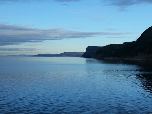 The wind was still, and the water was like a mirror. When I stopped, silence fell. Then I noticed the lapping of the waves and the distant calls of the seagulls. Birds would flap away, the wings slapping repeatedly on the water surface as they disappear into the distance. On the horizon, on the other side of the fjord, was a rugged silhouette, a darker orange than the sky in this morning light.