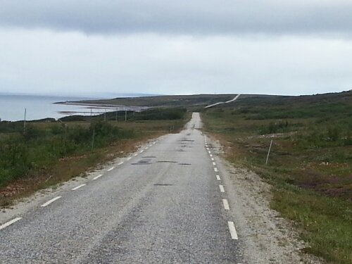 Unlike the road on the other side of the Porsanger fjord, the road did not hug the coast directly below massive cliffs rising directly up from the sea. Rather, the road undulated across grassy plains which ended in rocky or sandy beaches.