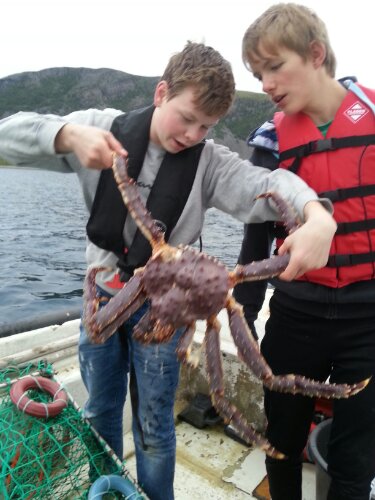 The other side of the big fjord, I met with Peder who helped arrange the boat trip. We had a chat, and he took me out with his son and his friend to collect crabs. The crabs were massive.