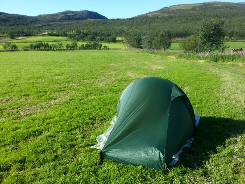 I am camping in the pastures of the 3rd most northern dairy in the world. This is my tent in the pasture taken the next morning in glorious sunshine. It will be a lovely sunny cycle to Mehamn.