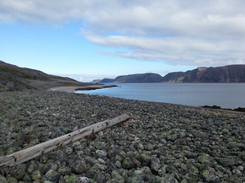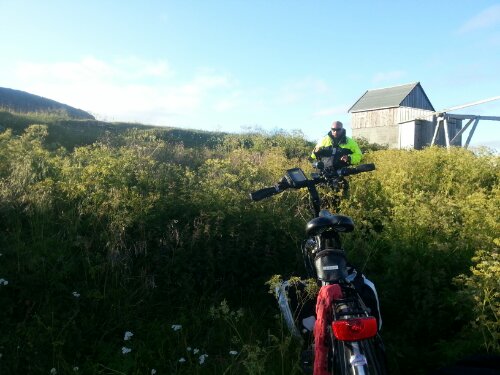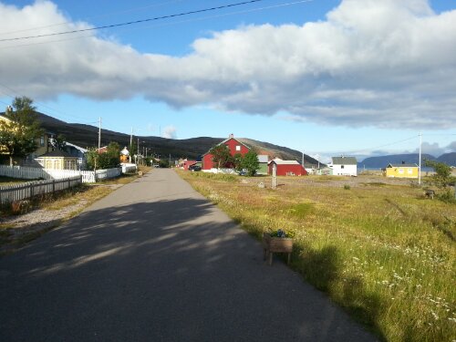 The day started grey but not raining. From Båtsfjord I cycled up and over a plateau to then cycle down Syltefjorddalen to the town of Syltefjord. The river in Syltefjorddalen is a prime fishing river and there were lots of spots to fish, as well as quite a few houses.