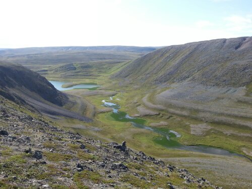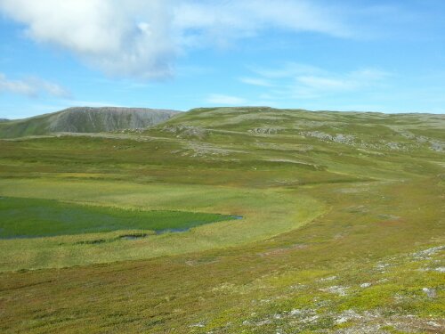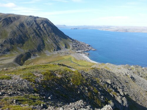 The valley passed a lake. I then climbed up to have an amazing view over a forgotten beach, and then up to view the tundra glacial, grassy bowl, and the view over Syltefjorden.