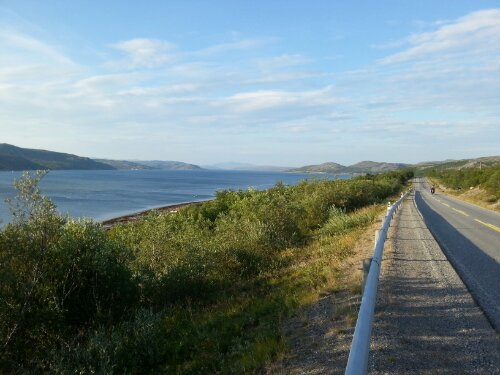 The home stretch into Kirkenes was along a beautiful fjord. The sun was still shining, it was warm, and the waters were twinkling. Heading north again, I had a tail wind. Awesome.