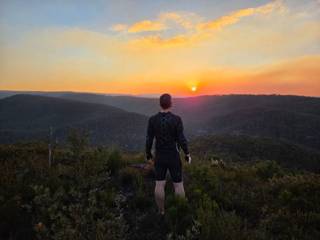 I couldn’t stay for long, though. I needed to get out of the canyon, and pass the icy swim, before it got dark and cold. But once out, and back on the plateau, I visited a little lookout and watched the sun set below the horizon, washed with smoke haze.
