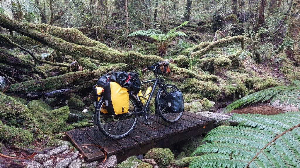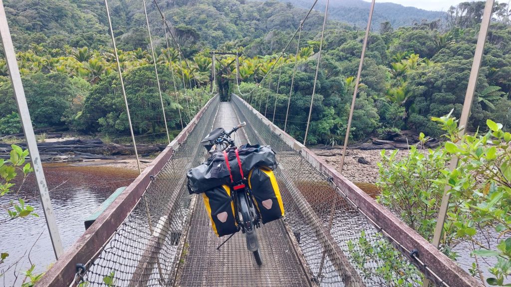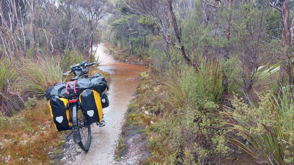 Then a short walk to the hut at the top of the track before I walked my bike down the mountain. On my bike it’s impossible to cycle over this playground of soccer ball sized rocks. My brake pads continued to disintegrate at alarming speed as the rain continued to act as lubricant. The last 5km of track was cyclable with fewer big rocks, although I had to step off when it was even vaguely steep to spare the brakes. Tomorrow the sun is coming out, so it will be a return to normality.. 😀