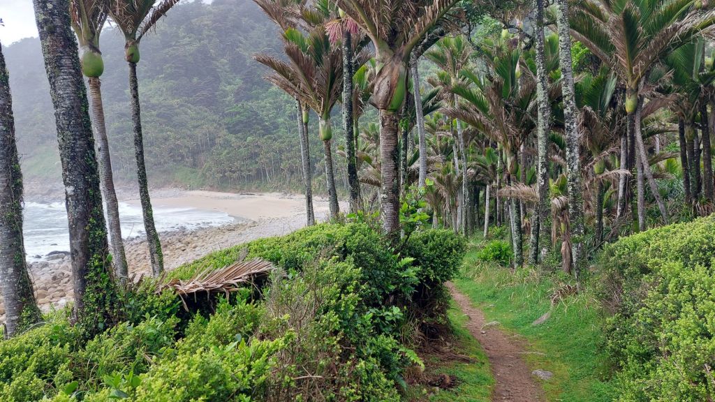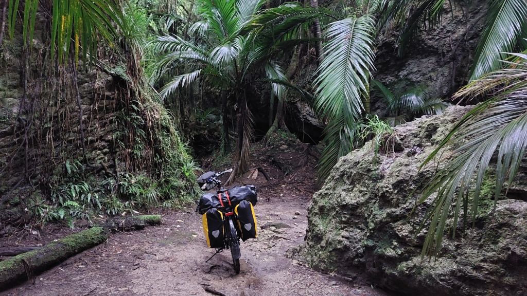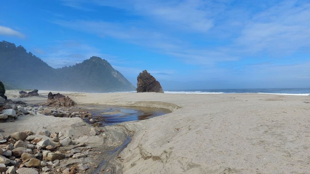 The sun poked through briefly this morning. It was wonderful being able to enjoy the beautiful scenery. The Heaphy Trail is a Great Trail of New Zealand, and hugs the coast, rising and falling over every creek and hill. A lot of pushing was involved.