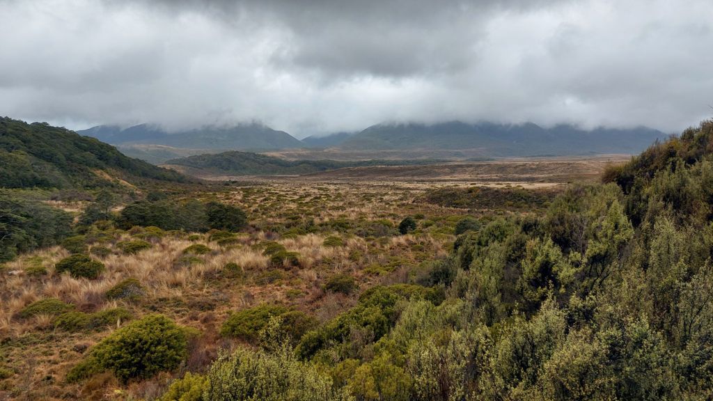 It alternated from drizzle to heavy rain as I lay in my snuggly sleeping bag. It remained like that all day. The rain stopped as I crossed the Gouland Downs. A beautiful view over the wide expanse of swampy brown grass.
