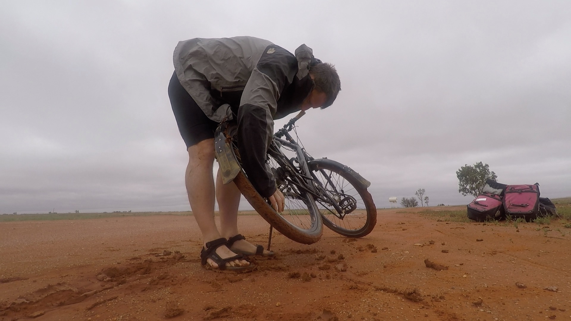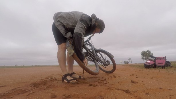 Returning to the bitumen pushing the bike was impossible. The bike had to be carried. Memories of the Oodnadatta Track in the rain. This clay is solid.