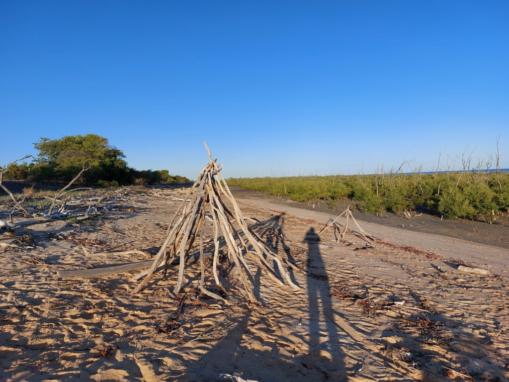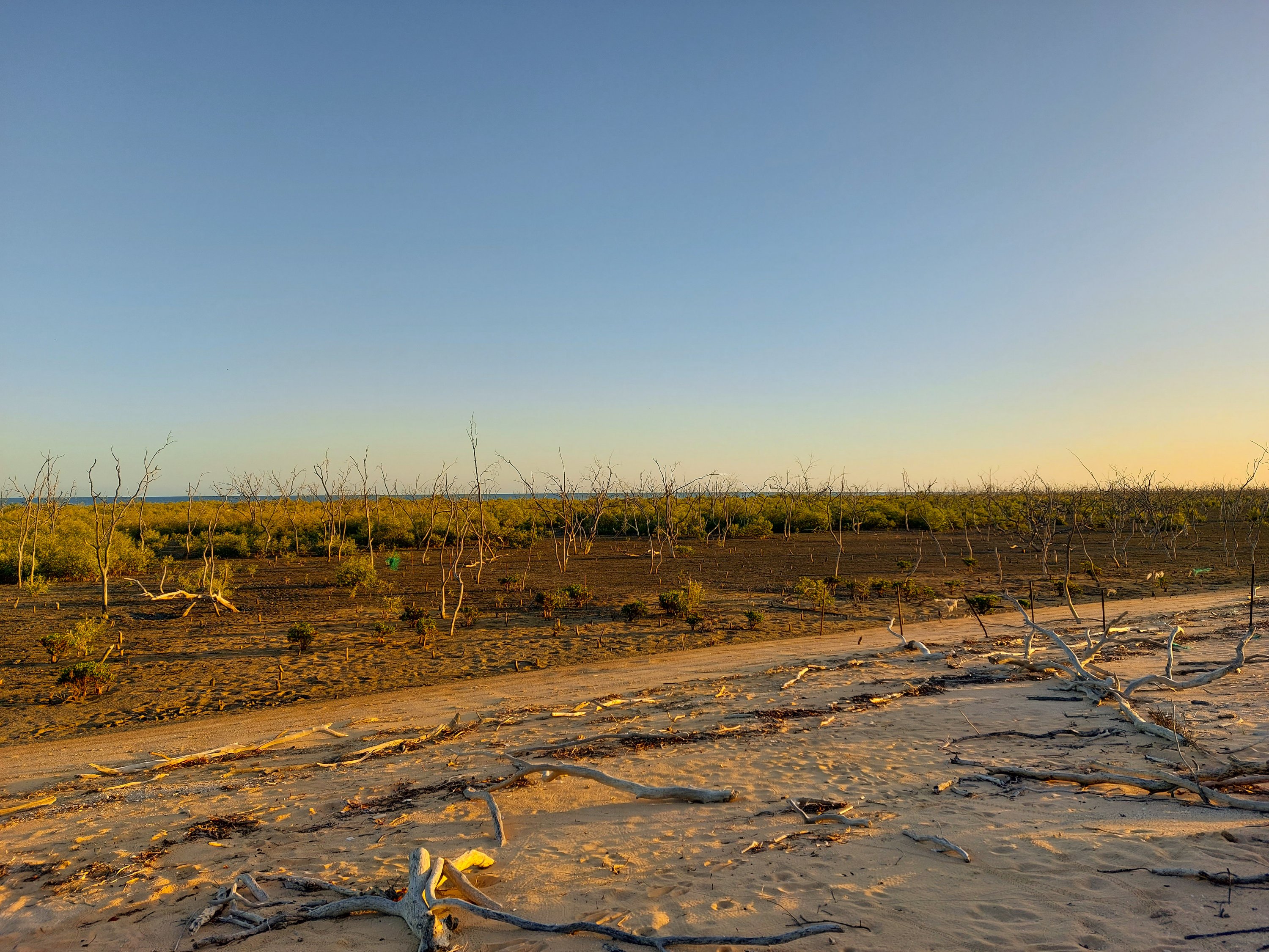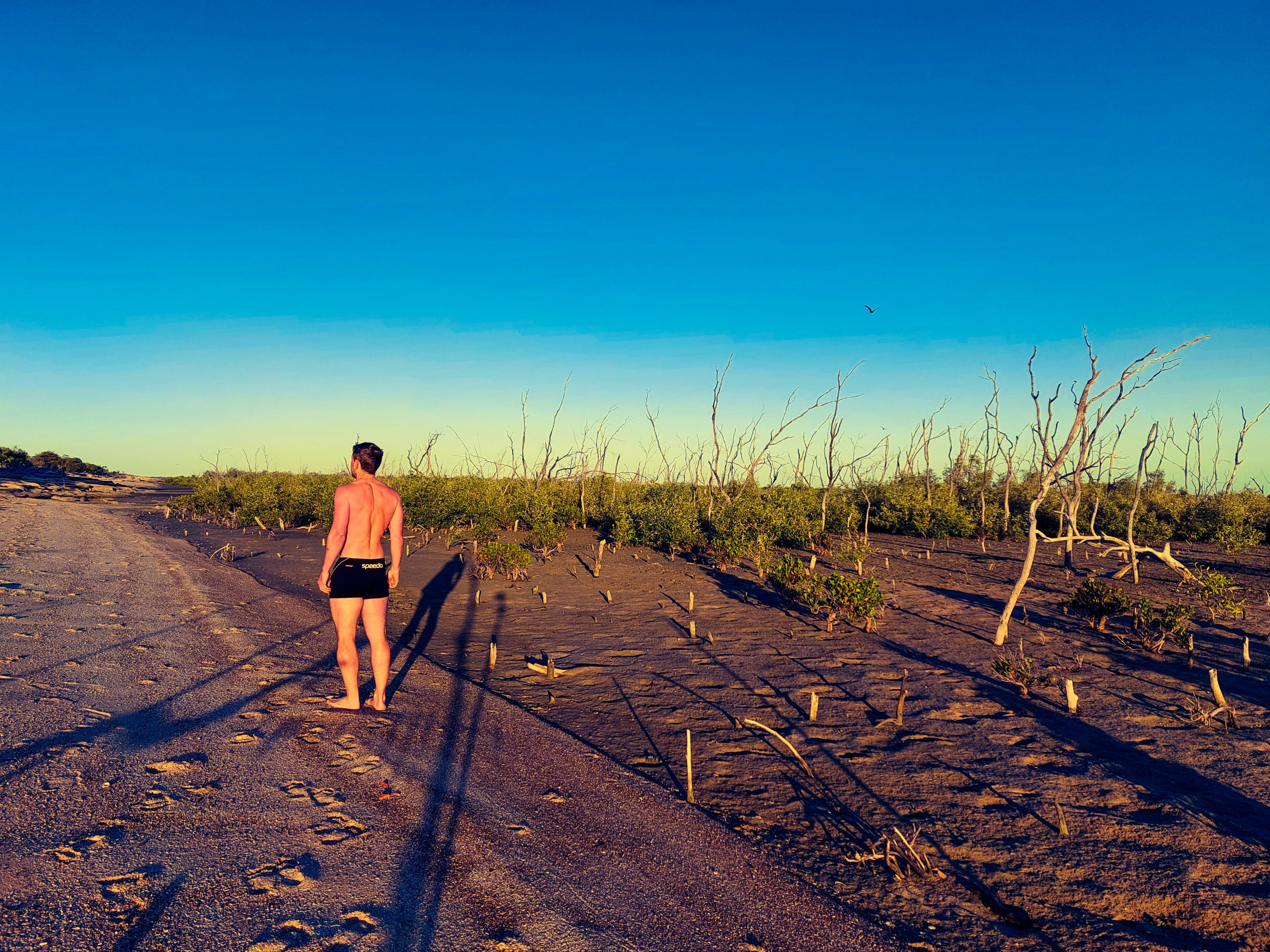 The sandy track followed the beach on the other side of a sandhill. I was exploring in the dark as the sun was just becoming a pink glow on the horizon. The sea began to be studded with little mangrove bushes. They became more dense. Finally they opened out into a mangrove swamp the other side of the beach. Dead trees stood high in the mud, with birds perched on their tips. It was a beautiful sight. Silence broken by bird calls. And this was all for me.