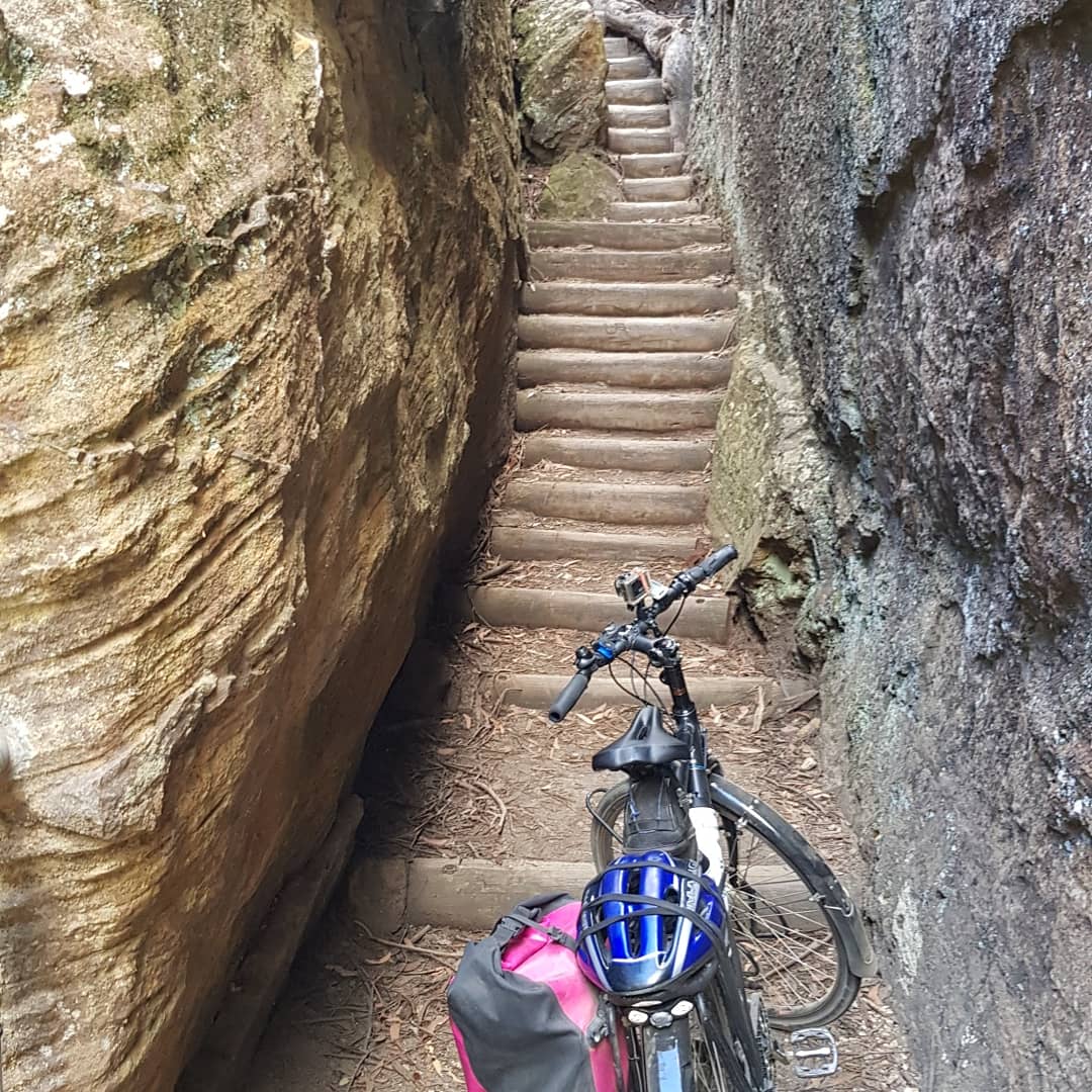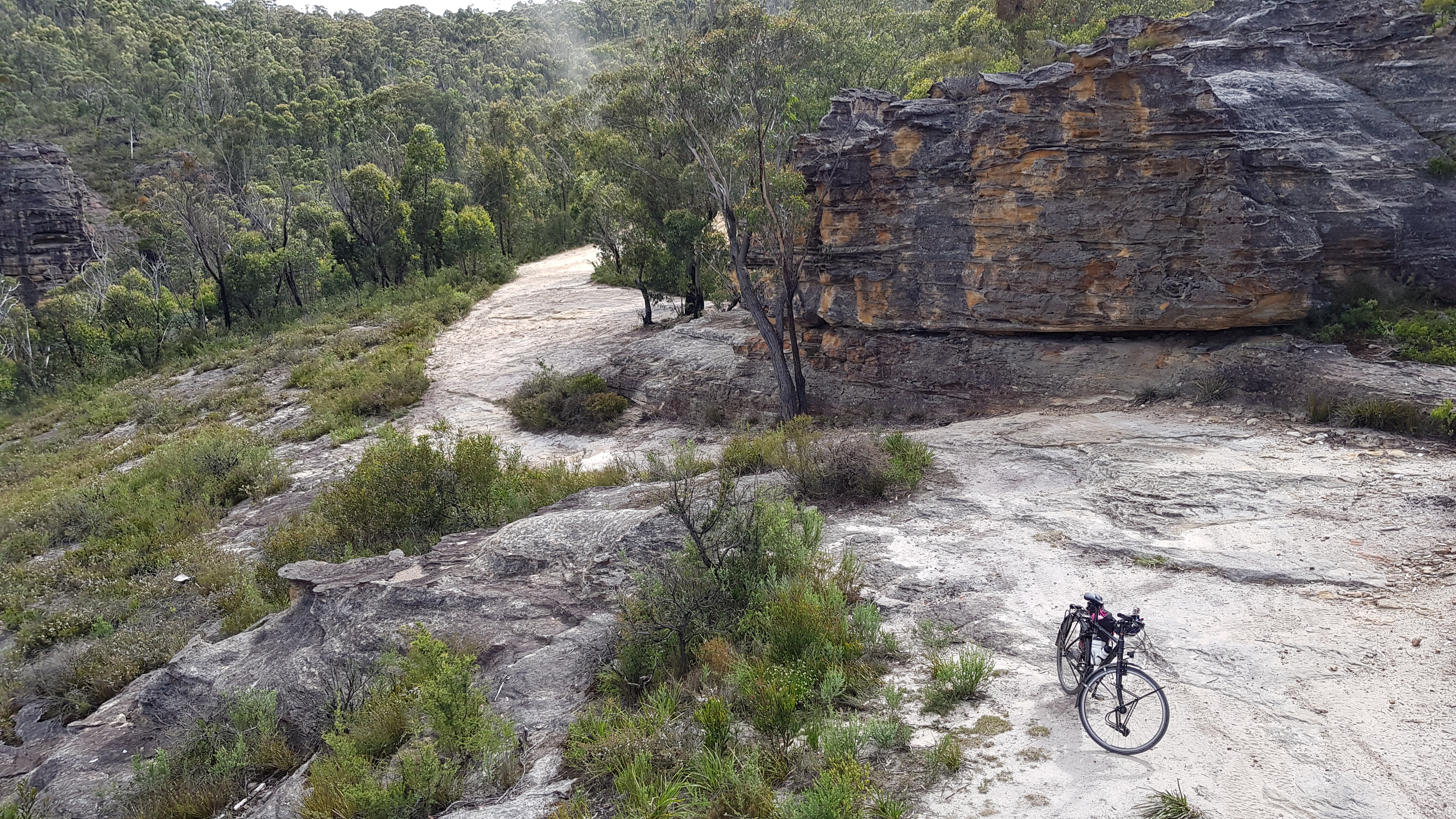 Going backwards in time through the day, to get to the Wolgan Valley, I had to descend from the Newnes plateau, where I passed through the Glowworm tunnel (I’ll come to that). The plateau comes abruptly to a halt at some vertical rock walls. There is a little walking path that makes its way down, but, it involved a little bit of carrying the bike.. 🙂