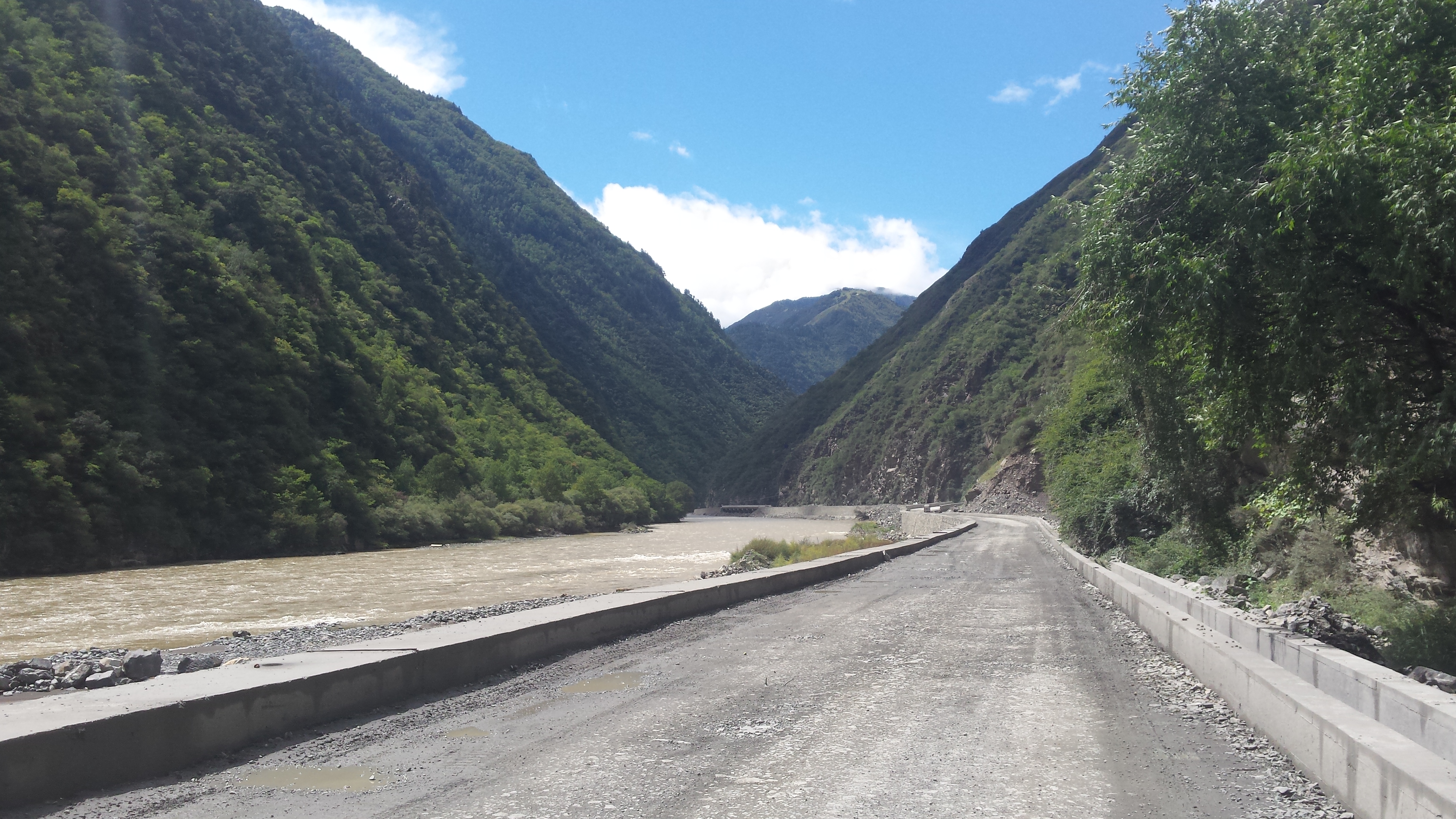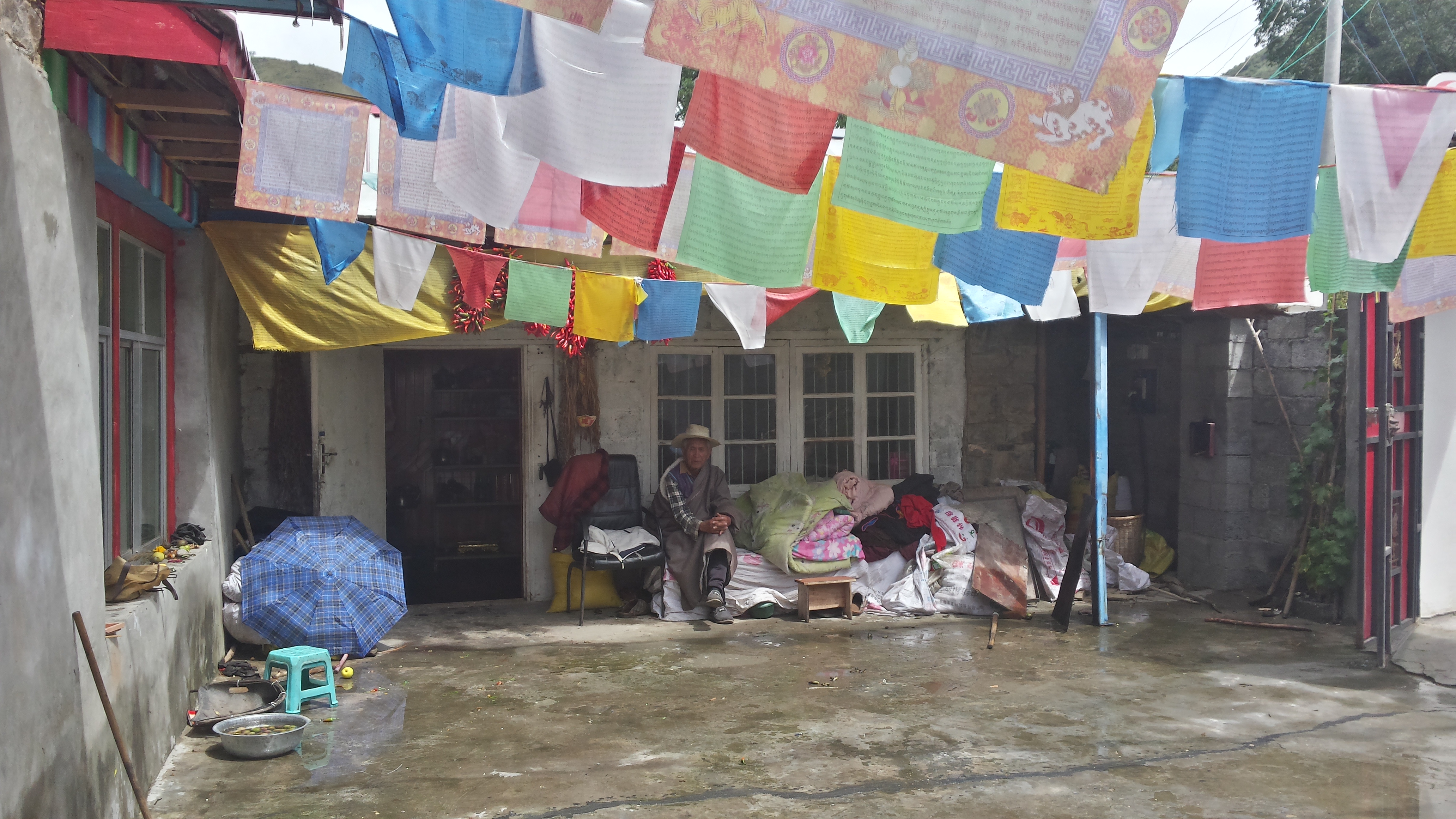 What a day. Sun. Rain. Torrential rain with thunderstorm. Roadworks on a rocky, muddy dreadful road. Flat tyre on the first 500m of bad road. Welcoming by lovely Tibetan family. Tyre fixed in dry shed, followed by lunch with the family – all 3 generations. Meeting 2 other cyclists. Only another 40km of dreadful road to go.