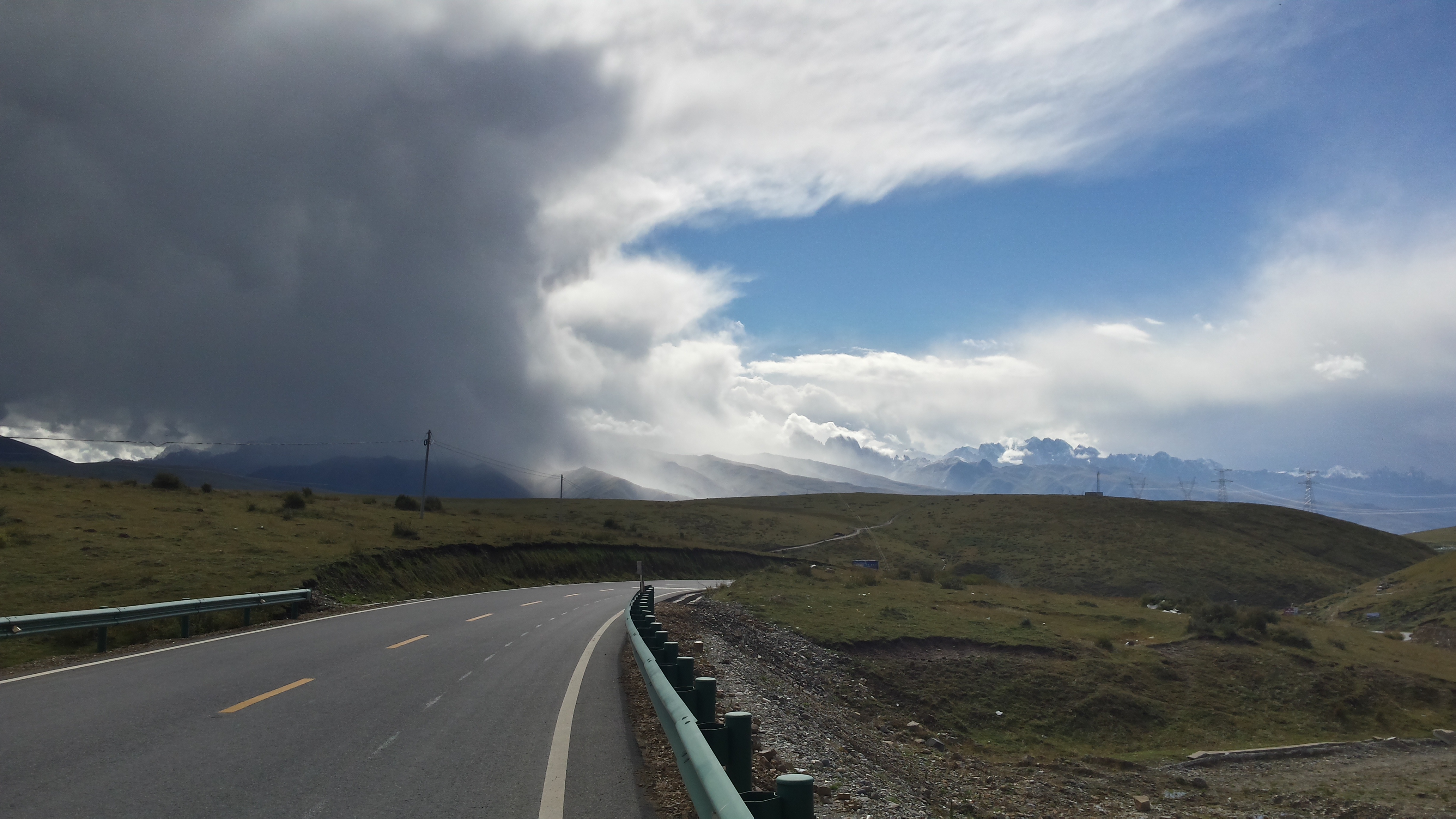 I cycled on the weather border. On one side was bright sun. On the other were the darkest of clouds. I cycled on the roadworks border. Behind me hell on earth. In front of me (mostly) prestine new road. And I cycled over a 4300m pass – my first 4000+ pass since Tajikistan.