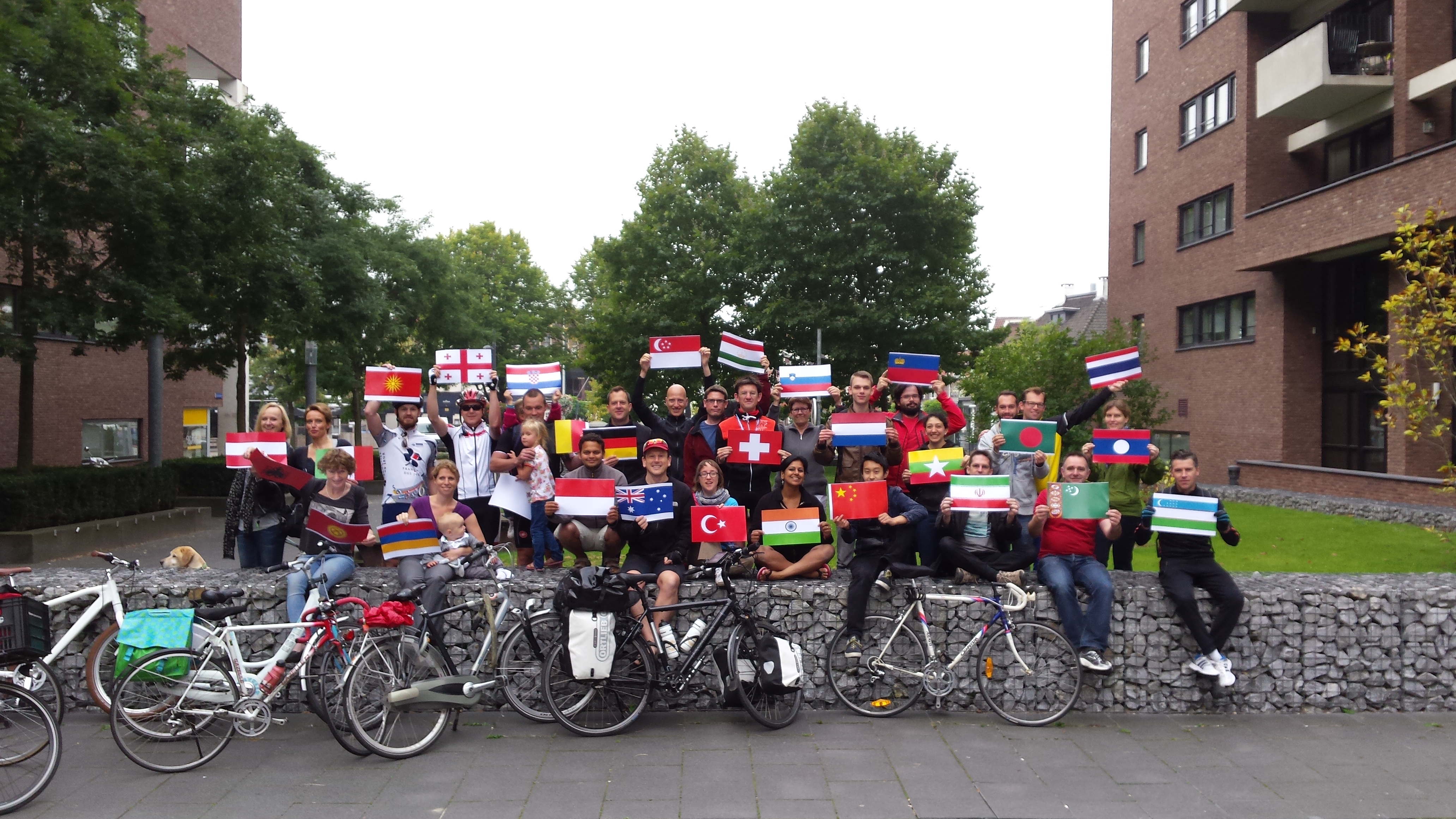 I guess it must be the excitement. 2 years in the making, the day arrives, and I have a cold. Not a bad cold, and nothing that a bit of fresh air, and 30 people with waving flags can’t fix. I walked out of my front door, and soon, the people amassed. Lots of friends, people from work, and even people that I didn’t know that had read about my departure in the newspaper. Really cool. After flying the flags of the 32 countries I will pass through, the moment came: not only am I unemployed, but I am also homeless. I handed over the keys to my apartment to the new tenants. And then the trip began – with 30 followers on their bikes. The Pied Piper of Eindhoven.