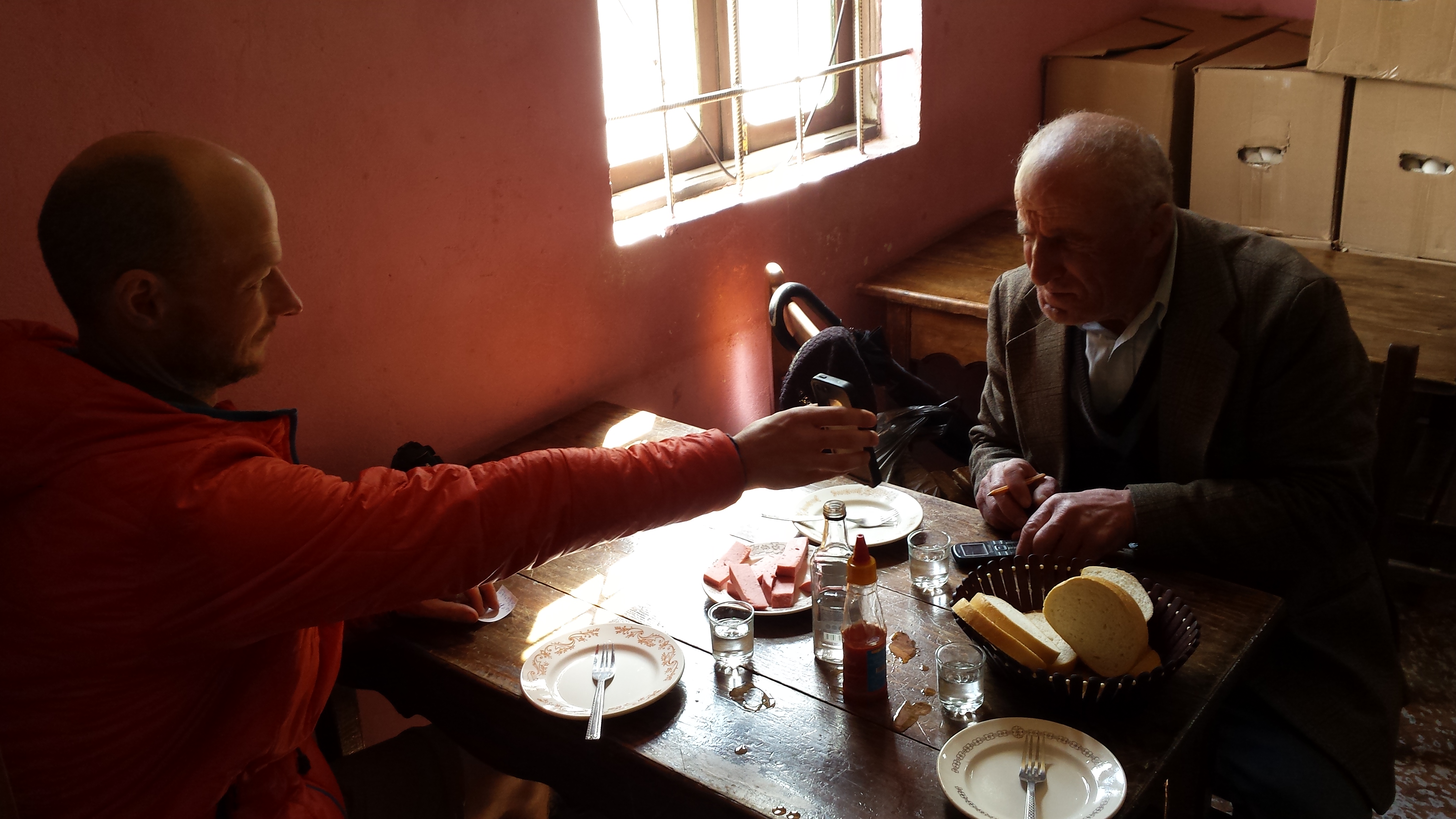 We were brought to the back room by the elderly gentleman and seated. He waved to the barman who pulled out a vast glass keg of clear liquid that he funnelled into a smaller glass bottle. A plate of sausage materialised as well as bread. Motivated by my three words of Russian, the man proceeded to lecture us in Russian, encouraging us to drink. Like in the fairy tails, the glasses never emptied. The bright daylight streamed in through the small window, making it feel like an inappropriate hour to be hitting the booze. The drinks were punctuated with lip-kisses, which I failed every time to capture on video.