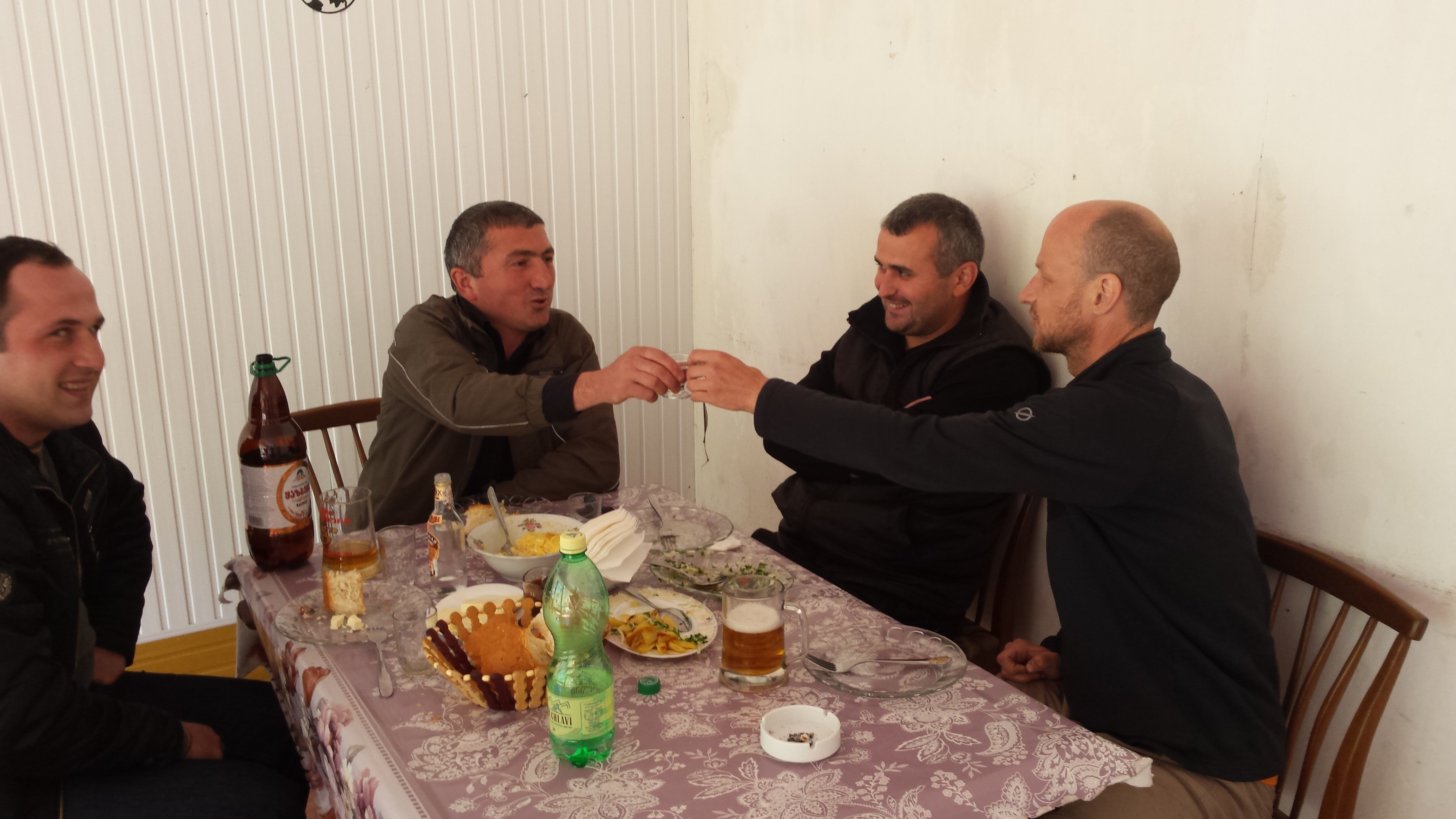 I sipped at my first and only glass. James did the drinking for the two of us, making sure that we were not insulting by rejecting this fine Georgian hospitality. I reminded James that we still had 70km to cycle. He seemed to be captivated by the offering of vodka, lip-kisses and sausage. Finally we bade our host farewell, and cycled a further 40km down the mountain before being invited for our next round of vodka.