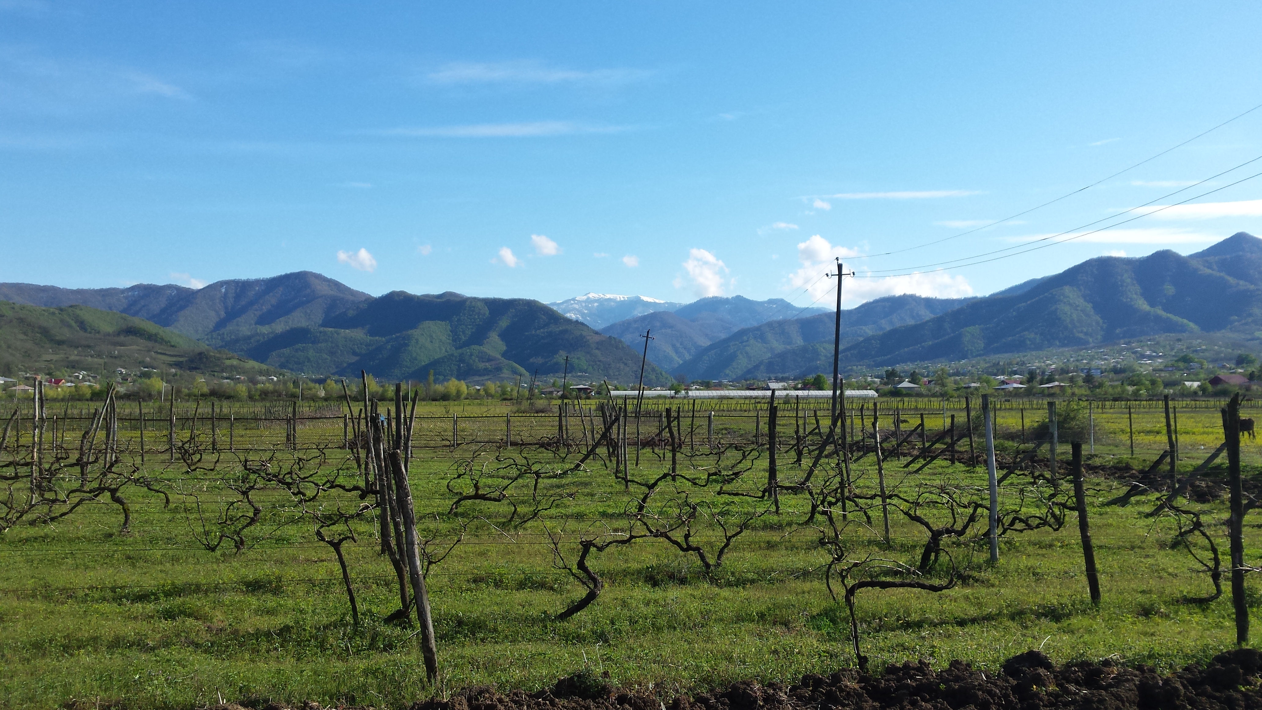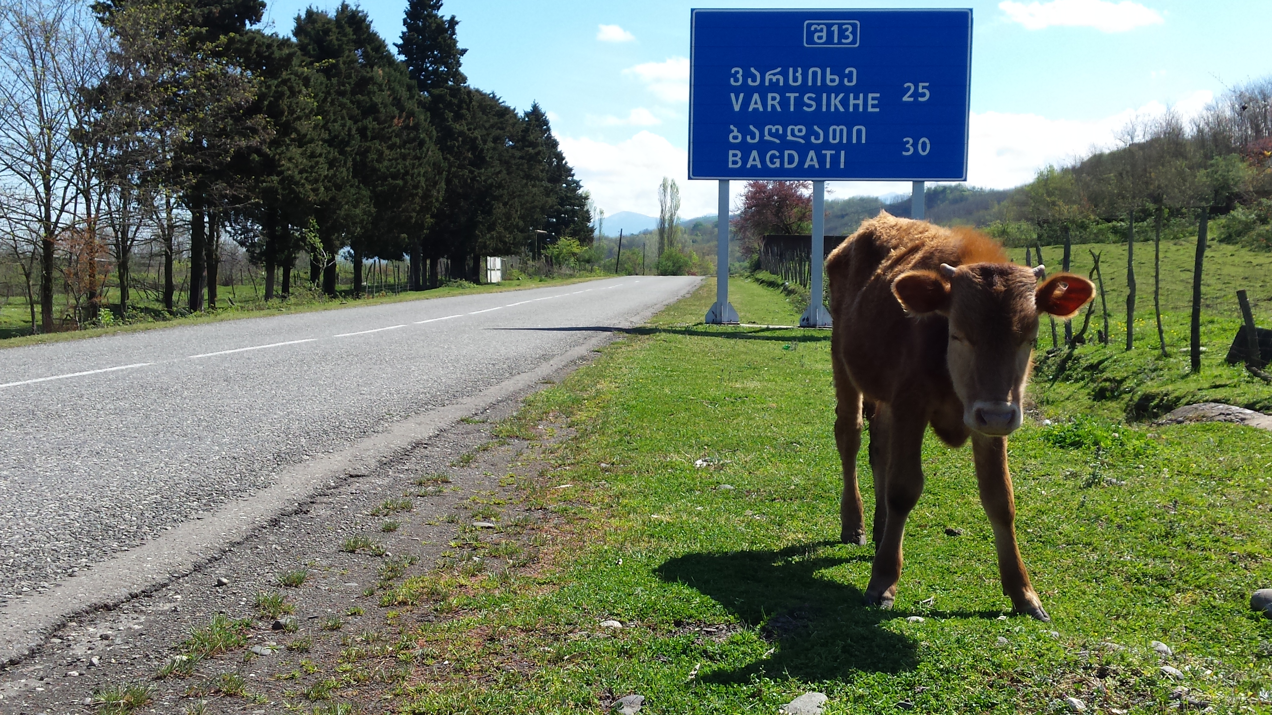 We left Samtredia, back down the road we had come up yesterday evening in the rain. Today we were riding under clear skies towards a wall of snow-capped peaks. In front loomed the snow capped minor Caucacus. We turned and behind us, on the other side of the wide valley were the massive white peaks of the major Caucacus. The mountains surrounded us today as we cycled down the bumpy road through farming, rural Georgia.