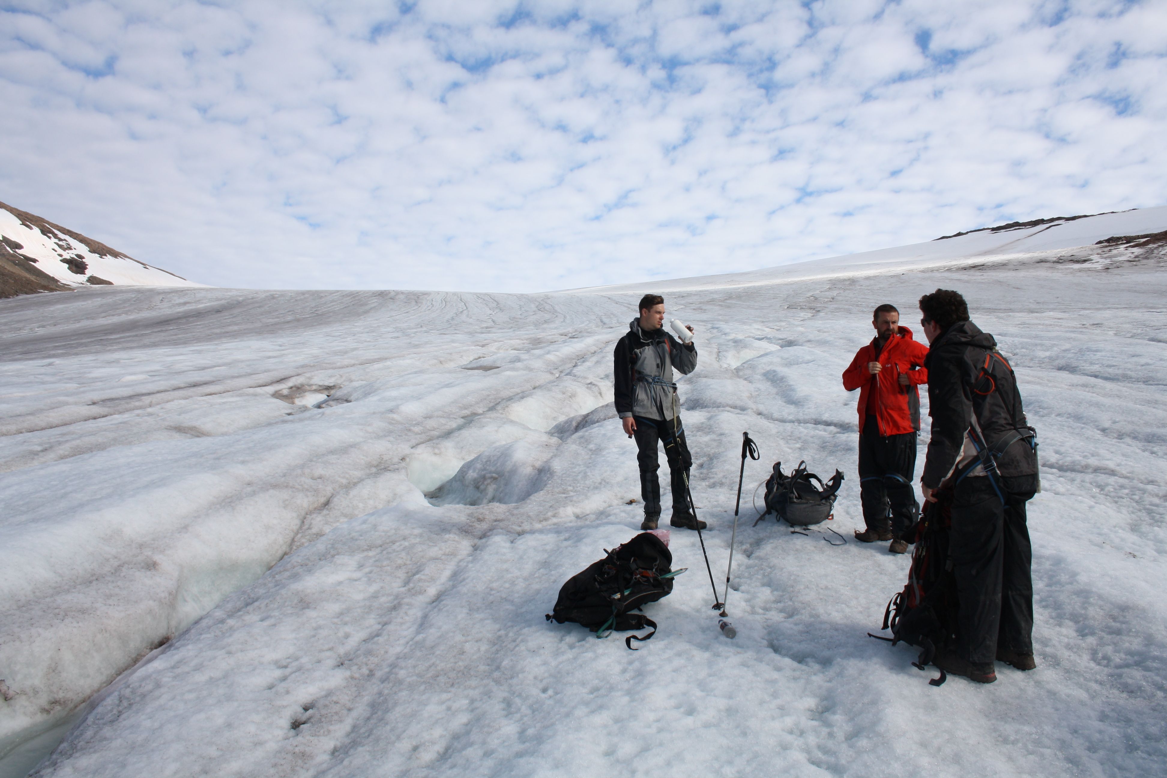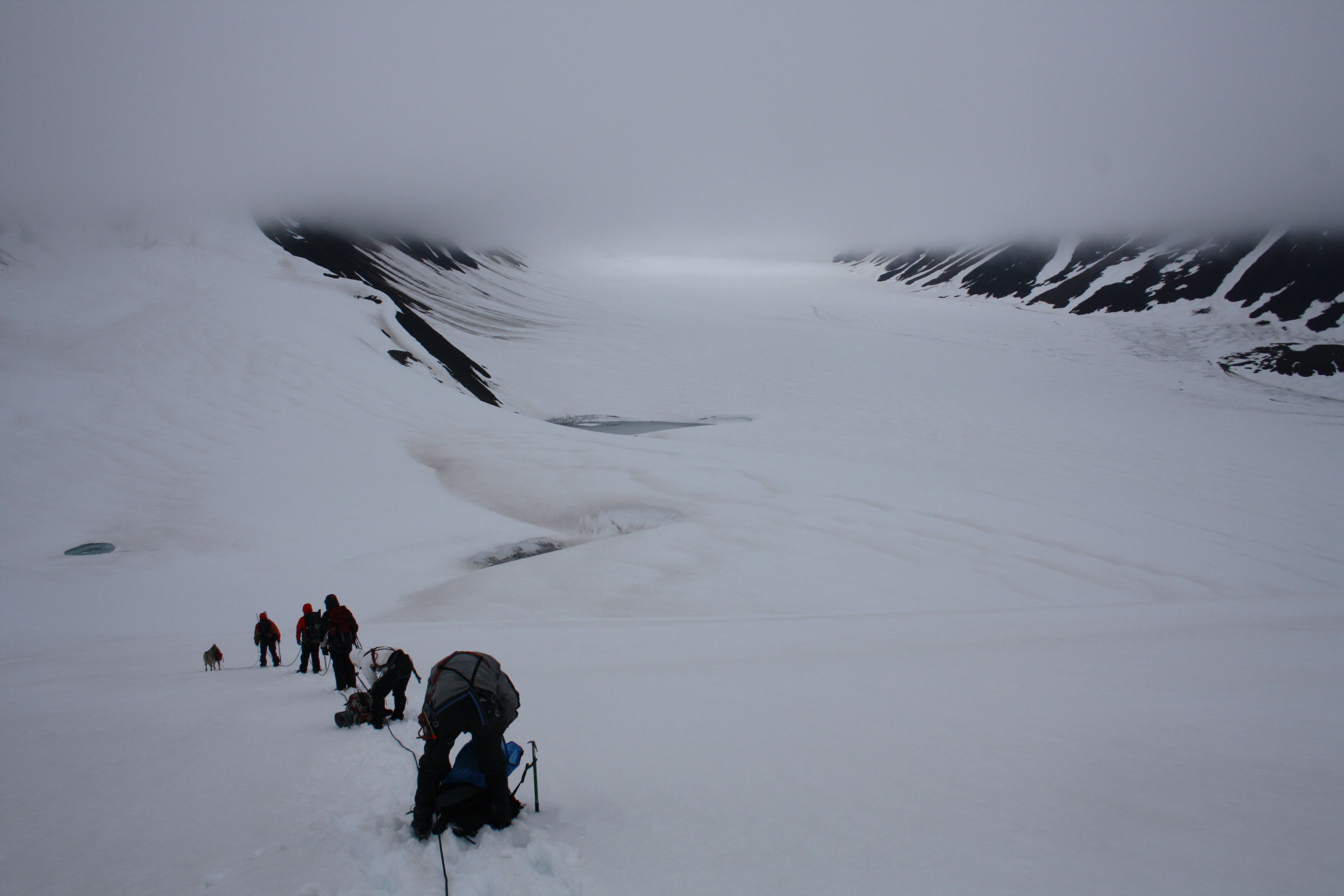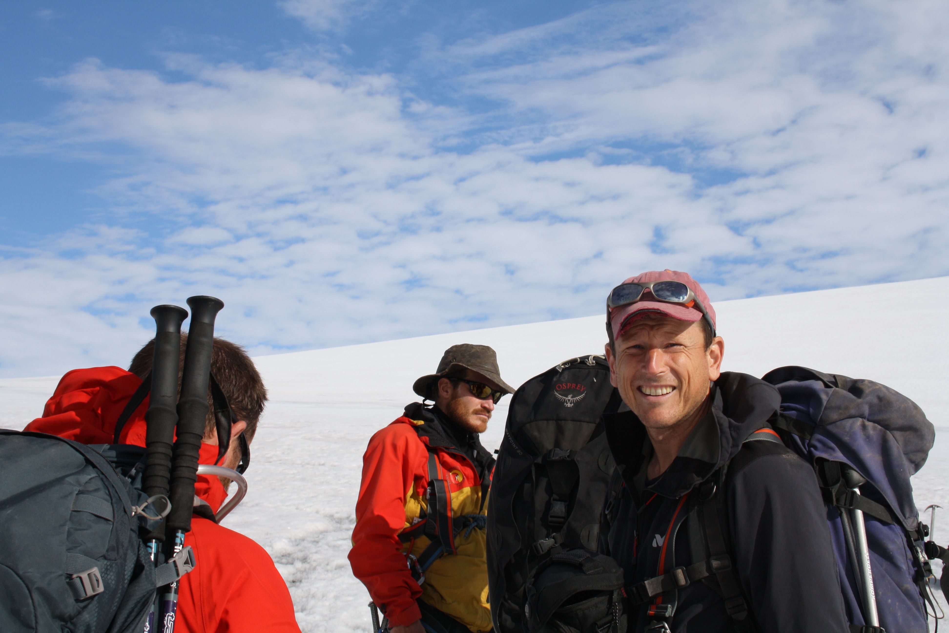 Crampons, harness, ice axe. Ice, snow, water, slush, mud, sinking sands, mossy bog, bouldery slushy bog, moraine, glacial river delta. Amazing glacial vista. Ice wasteland panorama. Desperate ice toilet rush by Steve. Lunch on the ice. Home stretch on the road.