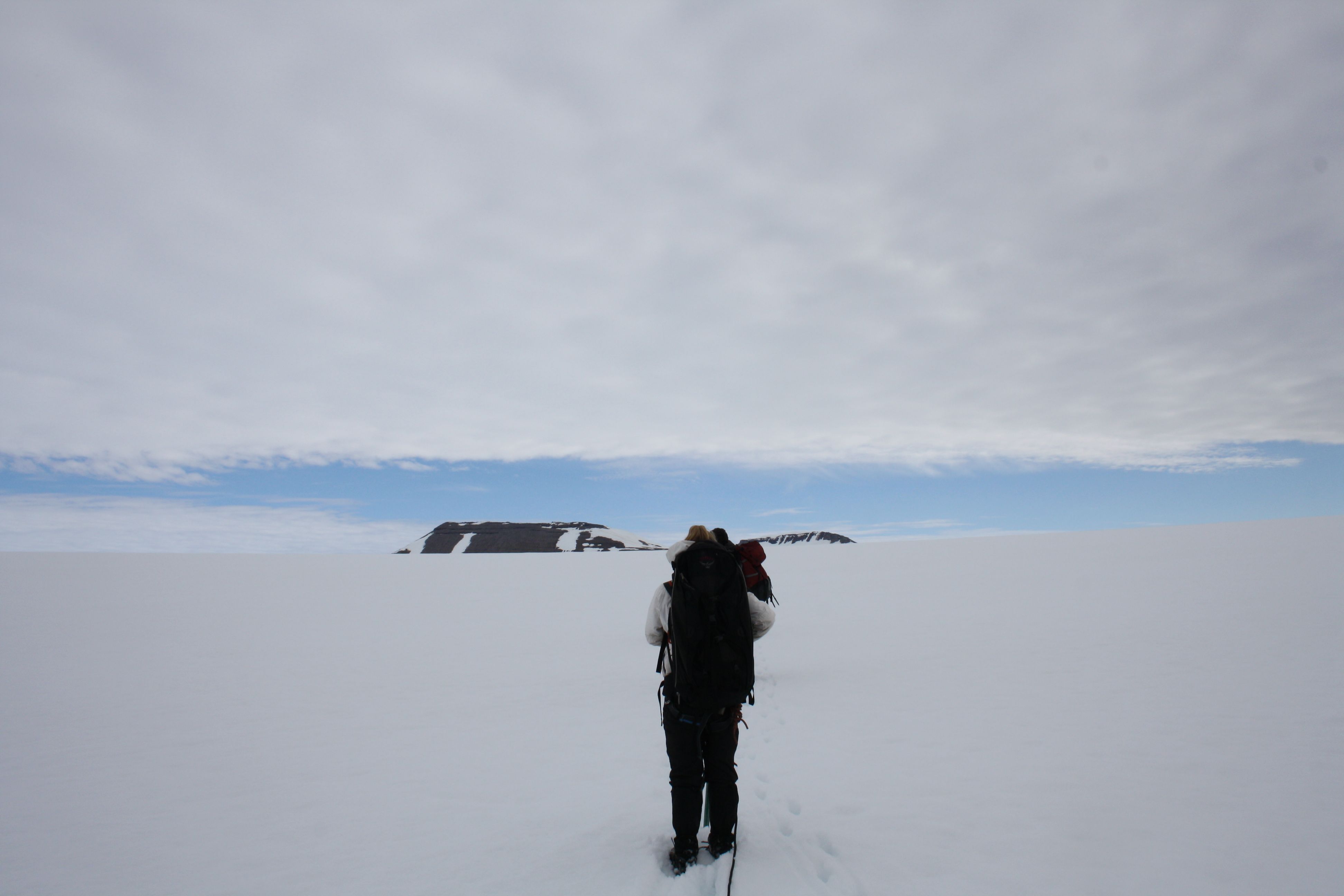 The view over the ridge was awesome! A panorama of ice and snow lay below us. Little lakes of ice broke up the white. The ice was surrounded by brown mountains rising up into the clouds. It was truly breathtaking.