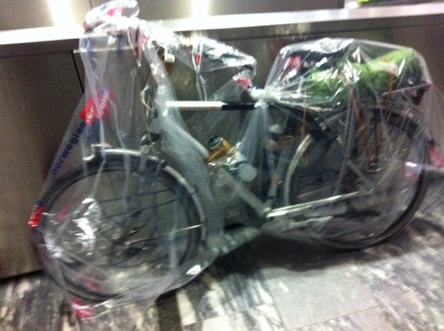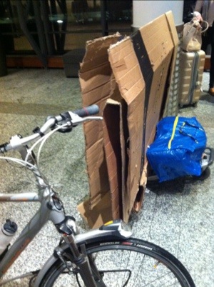 I was to check it in one floor higher. It didn’t fit in the lift. I took the bike out of the box, folded the box in half, and transported the trolley with the ikea bag, the bike with the handlebars sideways, and the folded droopy box one by one into the lift with the speedy closing doors. One floor higher I discovered that the checkin was closed for the night. They open again at 5am.