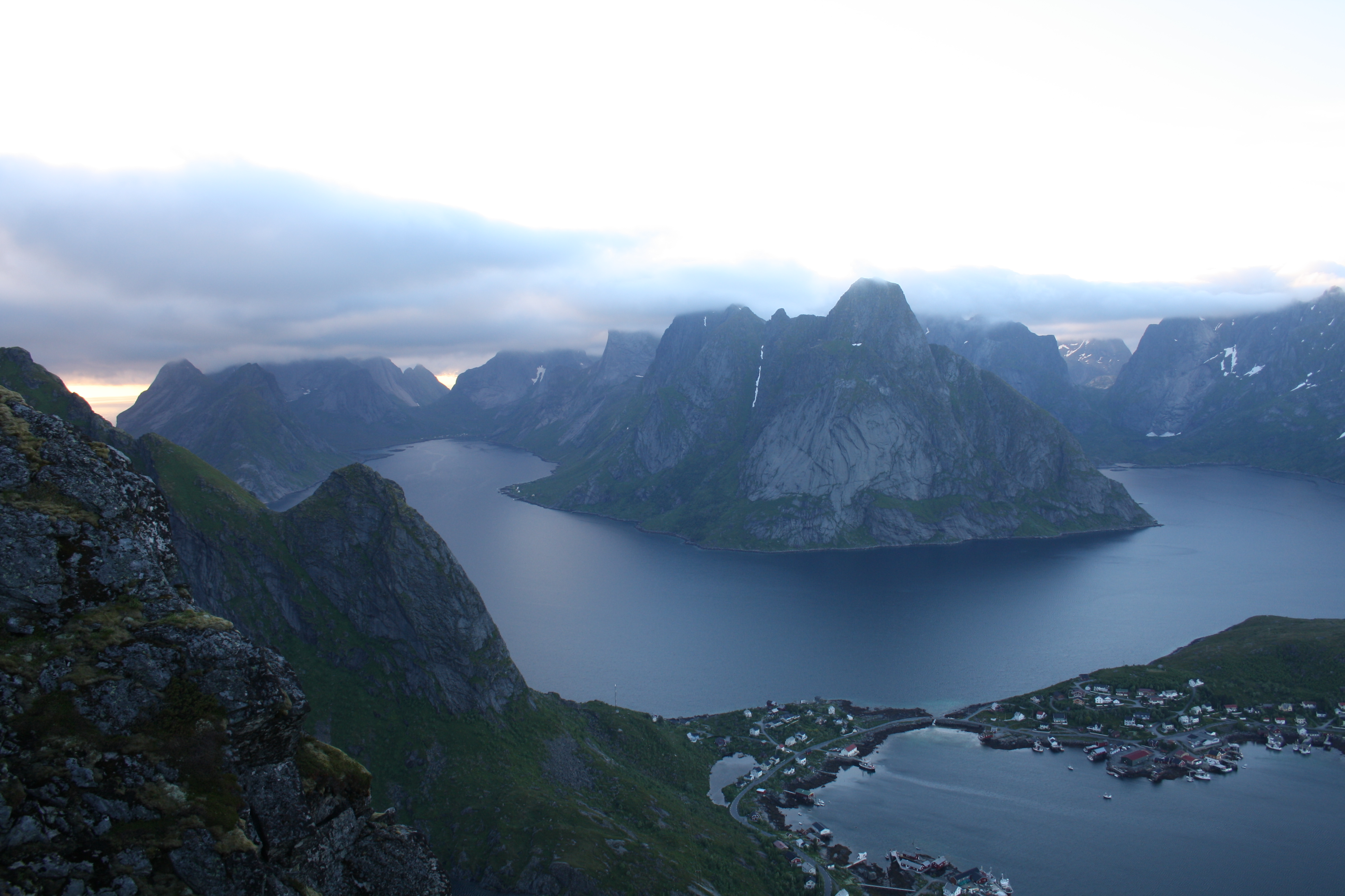 It was the perfect evening to take advantage of the midnight sun, and I cycled past the towering mountains like sharp teeth to the mountain overlooking the village of Reine. It is a famous short and steep walk, and no wonder. The views from the top were breathtaking.