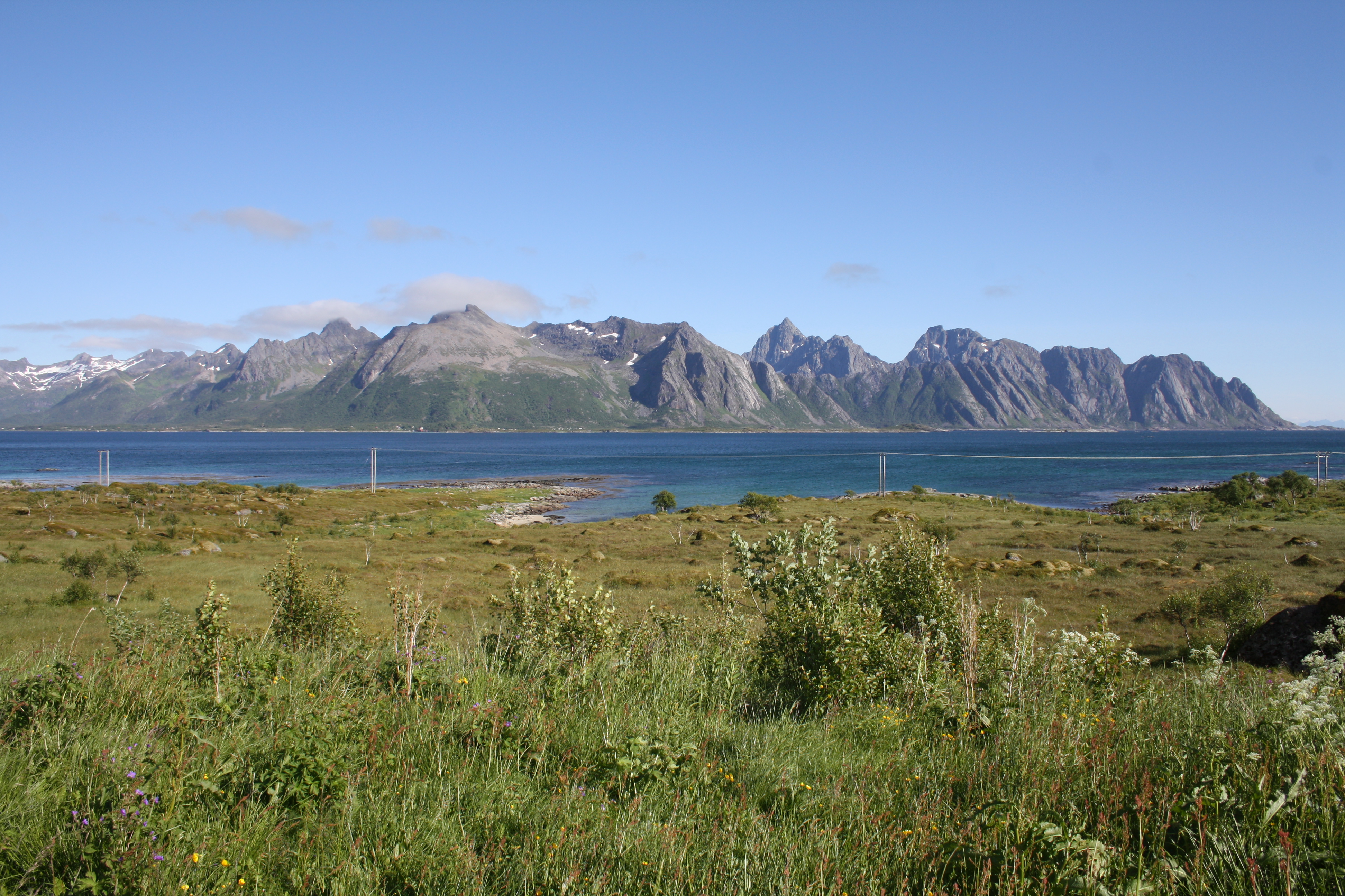 I had planned to cycle around the island of Gimsøya: apparently a highlight of the Lofoten islands. This would mean 10 extra kms of full on headwind slog to a camping ground that wasn’t answering their phone, and so, I concluded, may be closed. Instead, I concluded, the main road was with a tail wind. I couldn’t resist. Off I went at 25-30 km/h or more rather than 10-15. This is cycling. My mood lifted immediately. I immediately enjoyed the sun and the views.