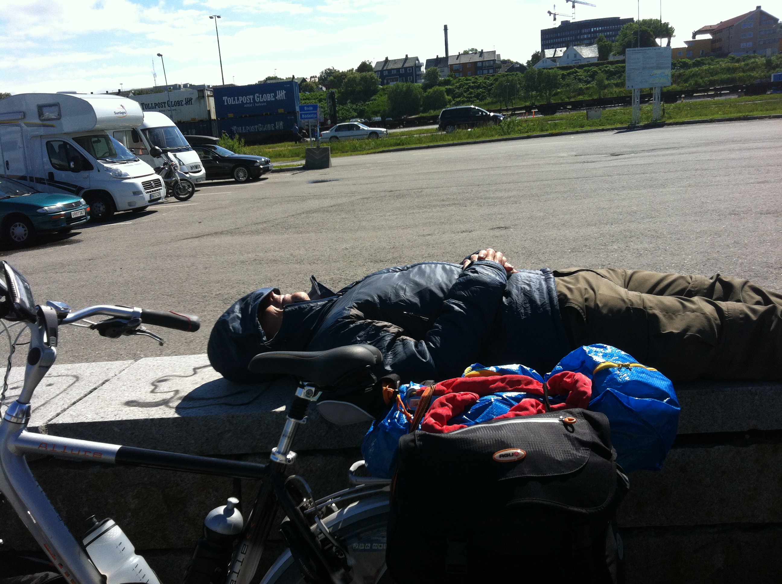 My bags arrived in Bodø. My bike arrived. And… Yes!! It was alive and in good health. I cycled around Bodø, went shopping and bought some emergency rations, and went for a snooze in the sun before the boat trip to Lofoten.