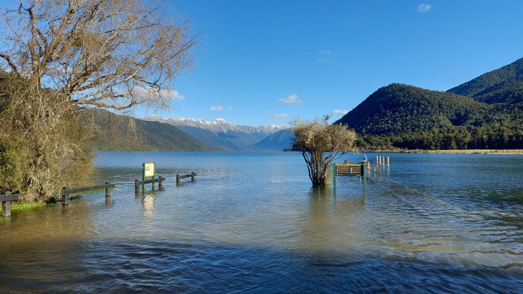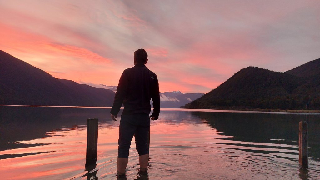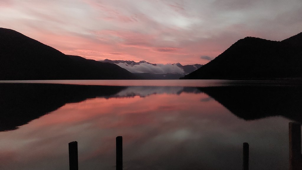 The sky was pink behind the snow capped mountains, a band of cloud hovering around waist level. The water was still, reflecting the sky. The ducks were calling, and then a black swans swam by, with a little baby – a shabby white, following. The morning was peaceful and beautiful. Lake Rotoroa.